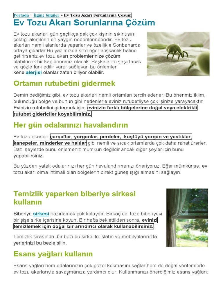 Ev tozu akarı mite alerjisi var ise yün kuş tüyü yatak yorgan yastık kullanmamak yün halı kalın perdeler kullanmamak nevresim kılıflarını 60 oc ve üstünde haftada bir yıkamak. Ev içi nem oranını 30 50 arasında tutmak tüylü hayvan beslememek fayda sağlar. Ev içi nem oranını yüzde 30 50 arasında.